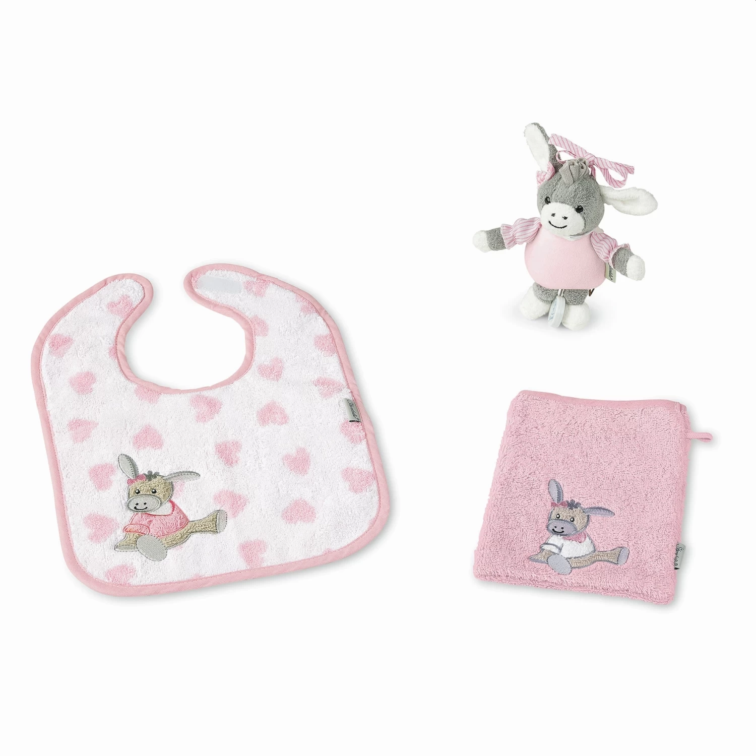 Das Set besteht aus einem Klettlätzchen, einem Waschhandschuh aus Baumwoll-Frottee und einer Mini Spieluhr.